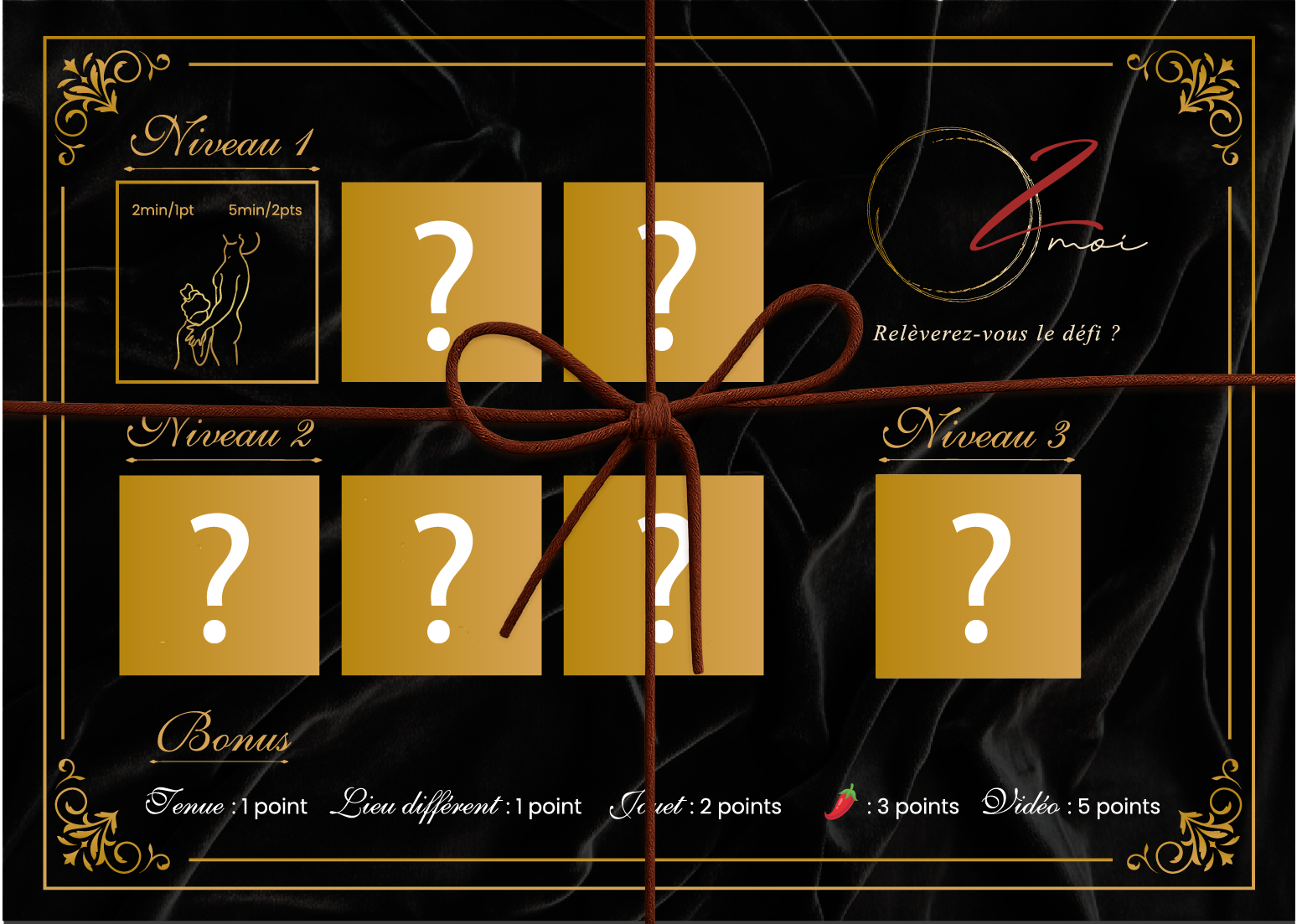 Dans une ambiance tamisée, chaque carte à gratter dévoile une surprise, une position inspirée du Kamasutra, un temps à respecter… et surtout, une belle occasion de se (re)découvrir.